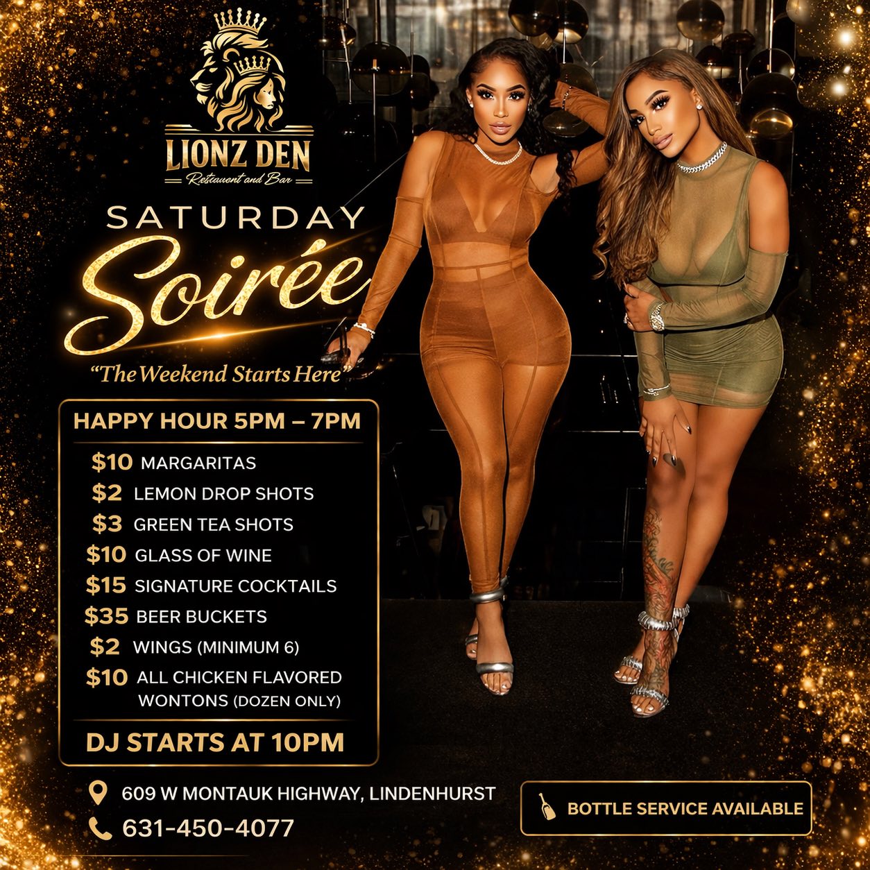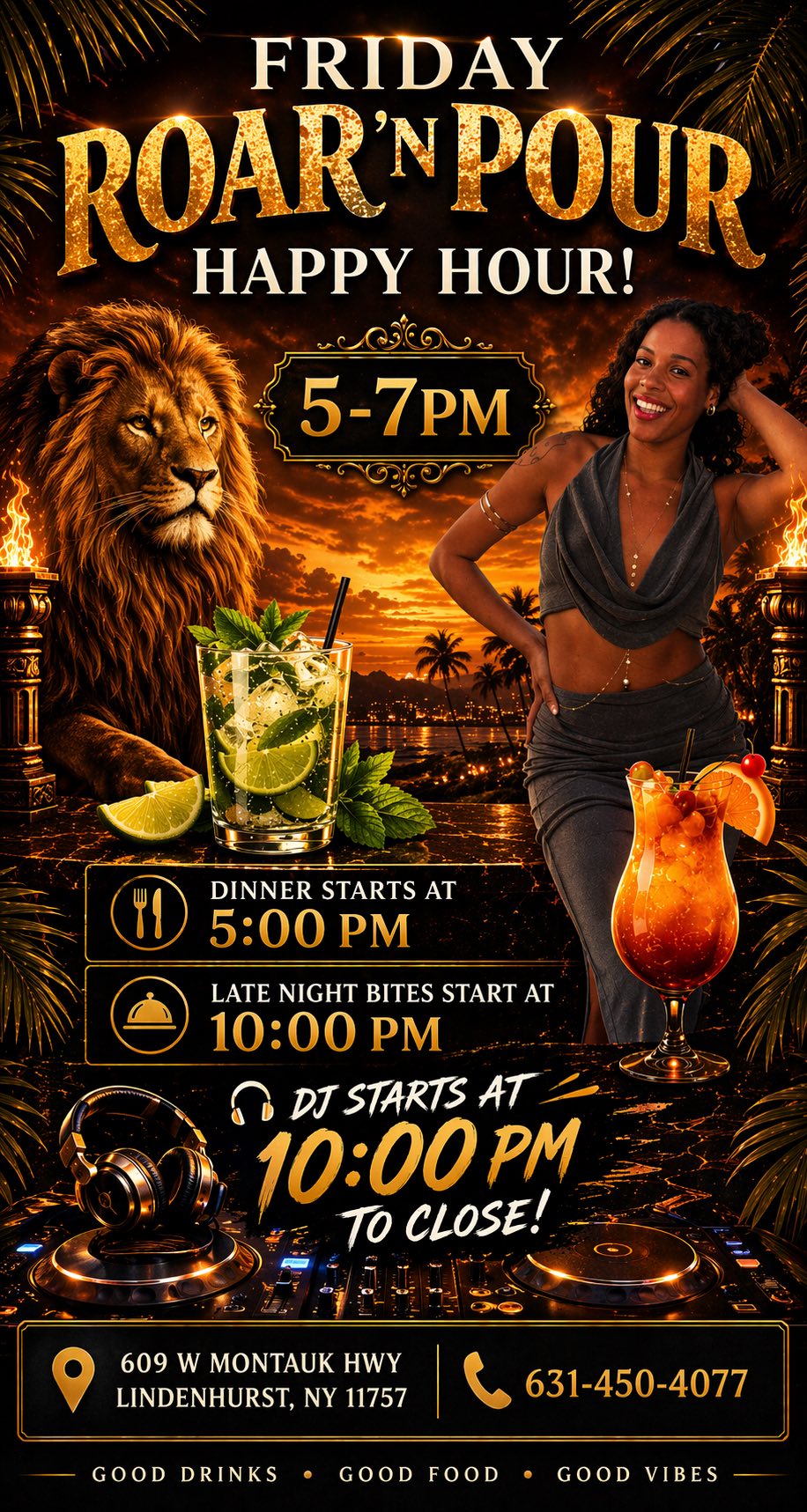 Happy Hour from 5–7 PM with drinks, food, and DJ entertainment